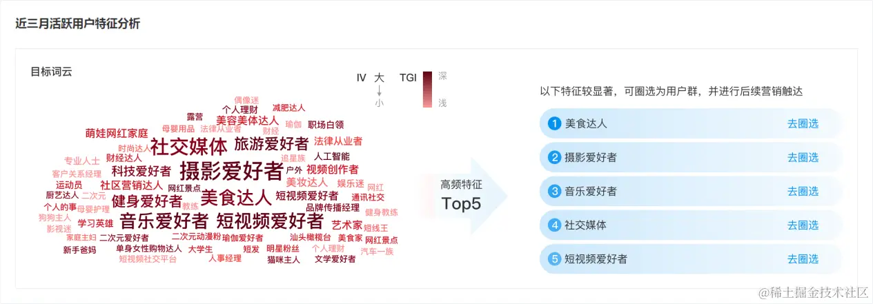 如下图,个推用TGI值来表示用户某特征的显著程度,TGI值越高,在词云图中该特征的颜色就越深。通过可视化特征词云图的形式,个推帮助APP快速了解近3个⽉的活跃⽤户特征。同时个推用户运营平台也支持APP基于词云中的显著特征快速进行人群圈选,并对接到个推消息推送对目标人群进行精细化触达。
