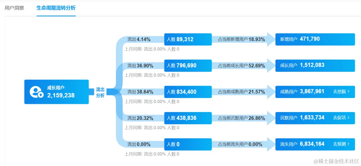 可分析APP⽤户处于不同⽣命周期阶段(新增、成⻓、成熟、沉默、流失)的分布情况,帮助APP对⽤户有个整体认知。
