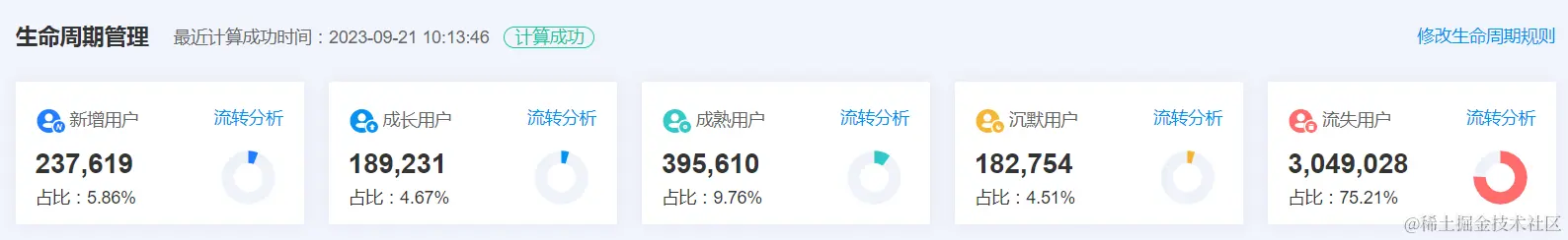 可分析APP⽤户处于不同⽣命周期阶段(新增、成⻓、成熟、沉默、流失)的分布情况,帮助APP对⽤户有个整体认知。