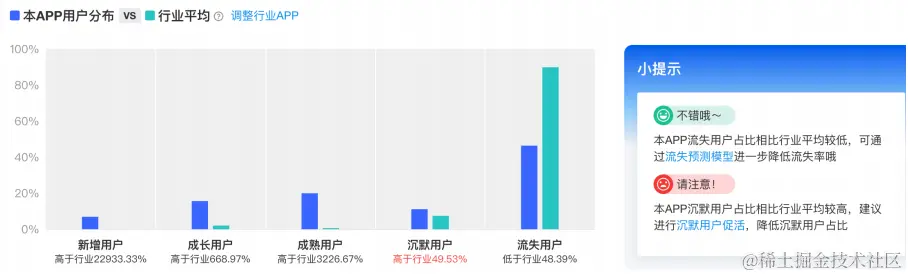 可以通过分析本APP和⾏业同类APP⽣命周期各阶段的差异,来分析本APP的运营现状。点击⻚⾯上的“调整 ⾏业APP”可修改想要对⽐的同⾏业APP。