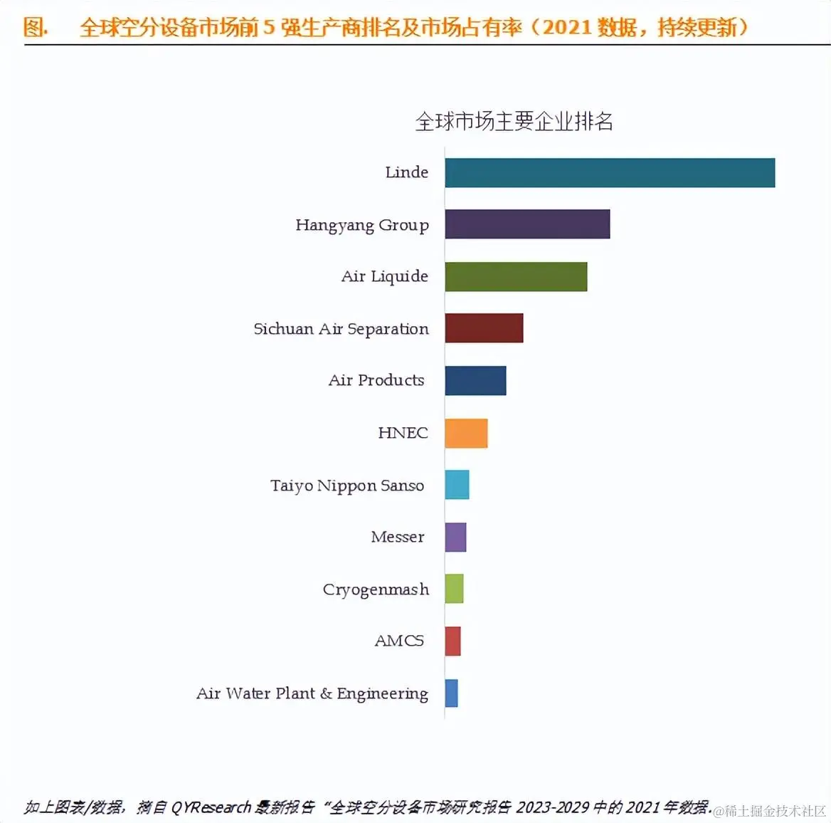 全球范围内空分设备生产商主要包括Linde、Hangyang Group、Air Liquide、Sichuan Air Separation、Air Products 、HNEC、Taiyo Nippon Sanso 、Messer 、Cryogenmash、AMCS 等。2021年,全球前五大厂商占有大约61.0%的市场份额。