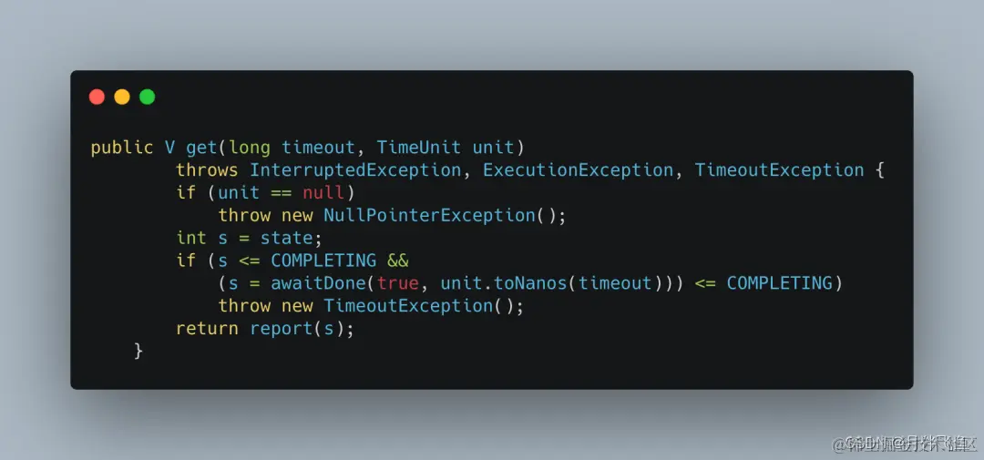 nanos = deadline - System.nanoTime()检查是否超时,如果方法已经超时,则会返回,在返回后如果任务的状态仍然<=COMPLETING,就会抛出TimeoutException()。 - 如果调用时任务没有执行完成,会调用parkNanos(),调用线程会阻塞在这里。