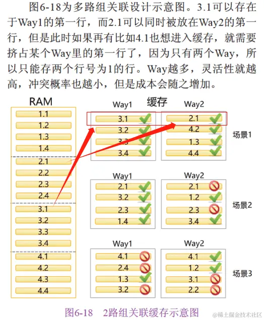 - 放置多份缓存存储器,每份缓存存储器被称为一路way,多路中相同行号的行逻辑上组成一个组set,一个组内的缓存行是相互竞争的。