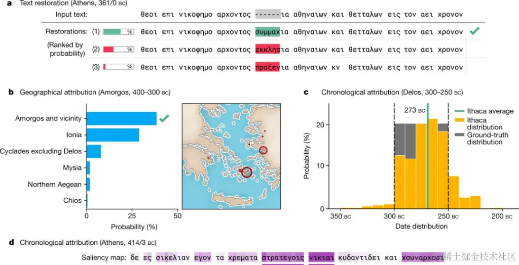 - 文本修复:Ithaca 预测了 3 个缺失的字符,同时提供了一套按概率排序的前 20 名解码预测 (上图 a);