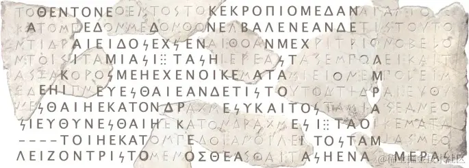 如下图的铭文,依照传统方法追溯到公元前 446/5 年,但最近被重新追溯到公元前 424/3 年。