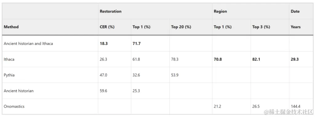 综合 Ithaca 在三项任务中的表现,结果整理如下: