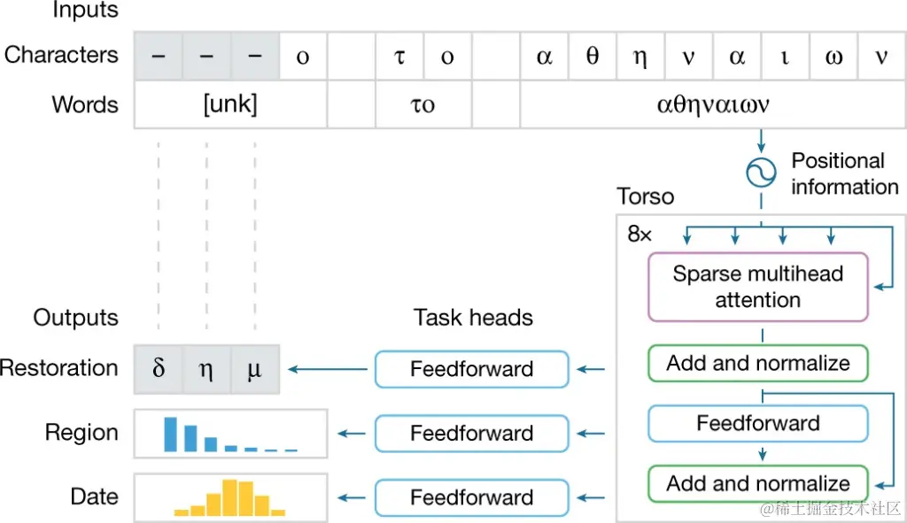 躯干 (Torso):Ithaca 的躯干采用叠加 Transformer 神经网络架构,它使用一种注意力机制 (attention mechanism) 来衡量输入的字符、单词对模型决策过程的影响。