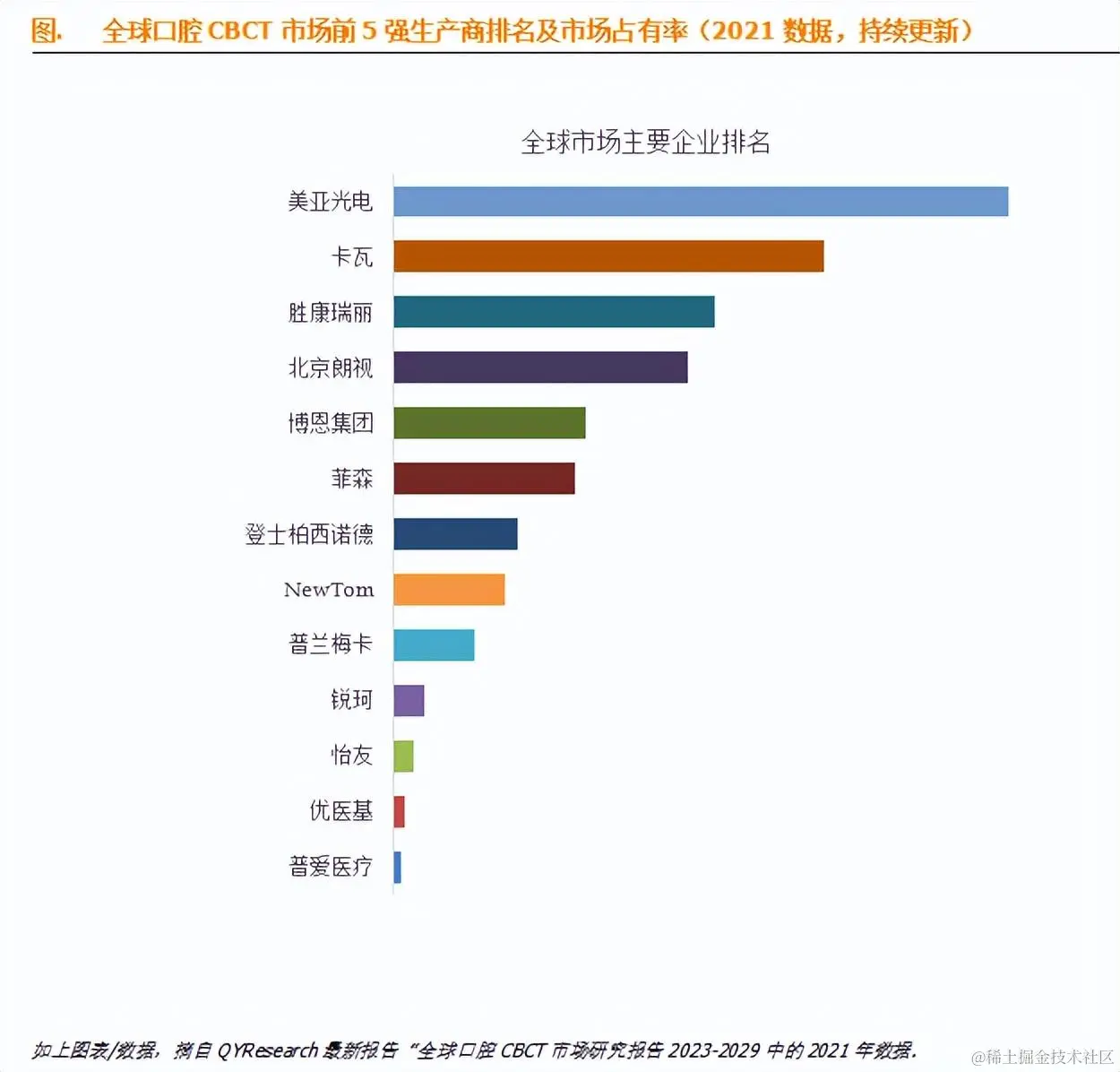 全球范围内口腔CBCT生产商主要包括美亚光电、卡瓦、胜康瑞丽、北京朗视、博恩集团、菲森、登士柏西诺德、NewTom、普兰梅卡、锐珂等。2021年,全球前五大厂商占有大约75.0%的市场份额。