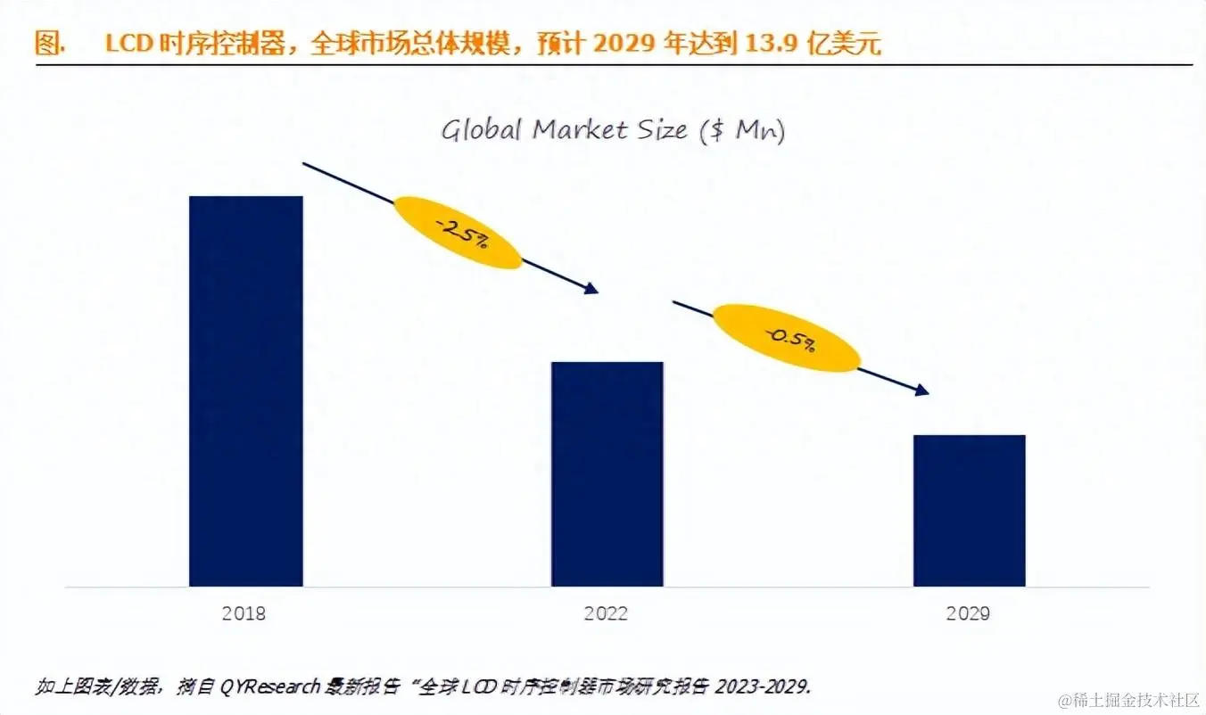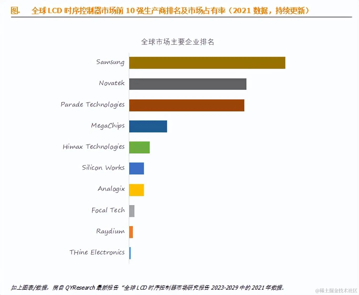 LCD时序控制器,全球前10强生产商排名及市场份额 QYResearch市场调研 2023-11-13 84 阅读1分钟 据QYResearch调研团队最新报告“全球LCD时序控制器市场报告2023-2029”显示,预计2029年全球LCD时序控制器市场规模将达到13.9亿美元,未来几年年复合增长率CAGR为-0.5%。 全球范围内LCD时序控制器生产商主要包括Samsung、Novatek、Parade Technologies、MegaChips、Himax Technologies等。2021年,全球前四大厂商占有大约67.0%的市场份额。