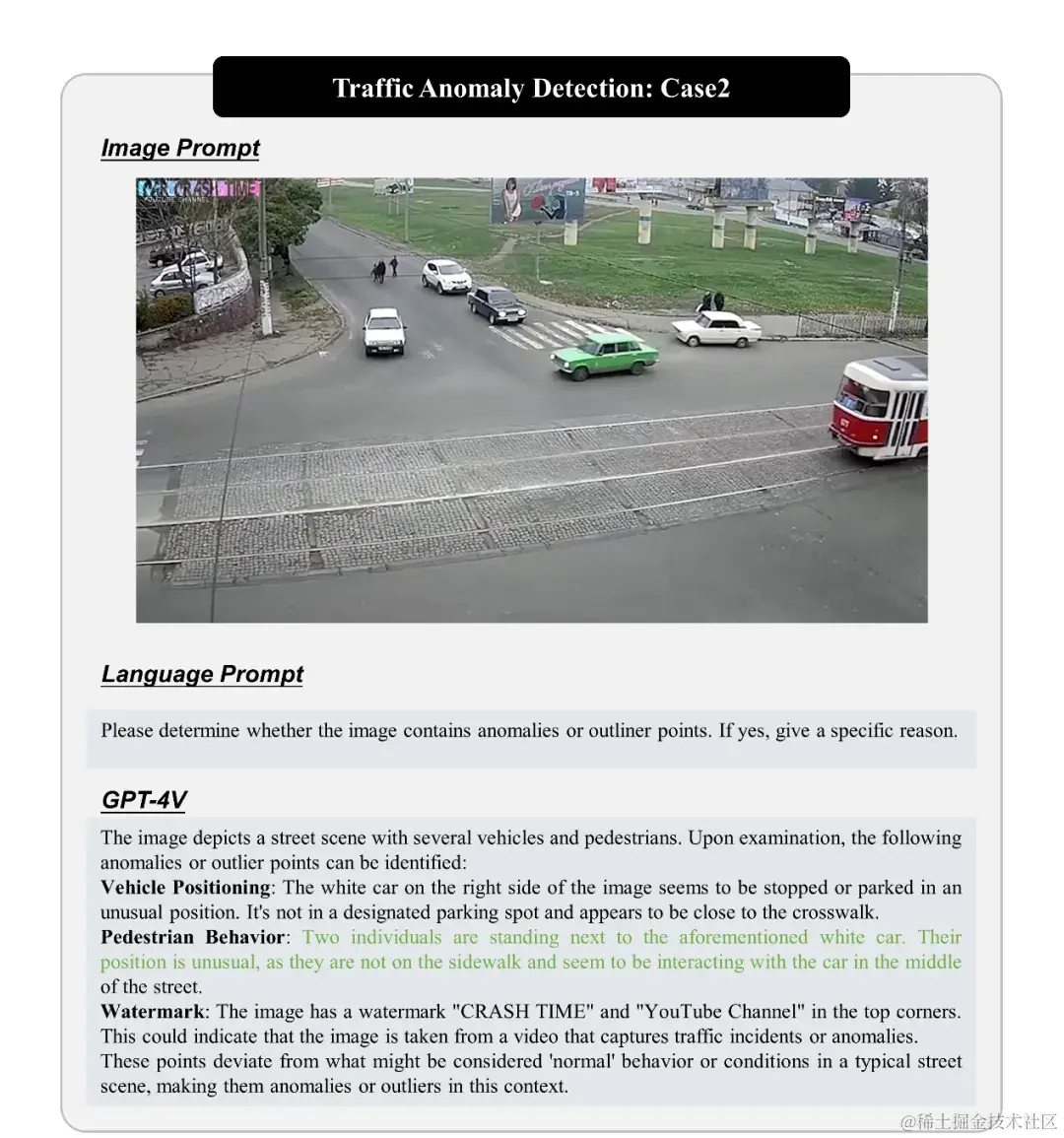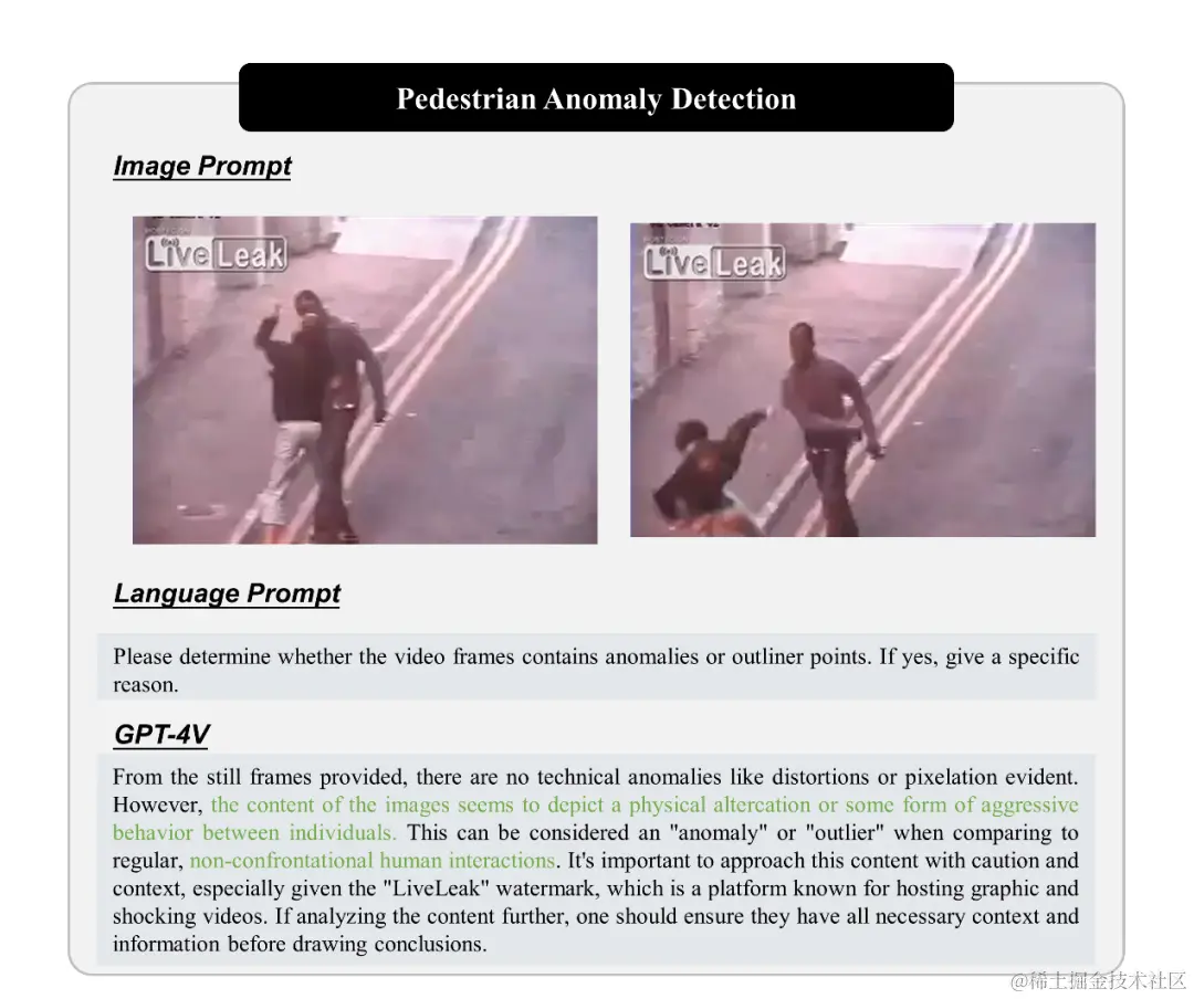 全局语义理解能力:GPT-4V 对全局语义的理解能力表现在它能够识别整体的异常模式或行为。例如,在交通异常检测中,它可以分辨正常的交通流和不规则事件之间的区别,并且提供了关于异常检出的详细解释。这种全局理解使其非常适合在开放世界中识别偏离正常分布的异常点。