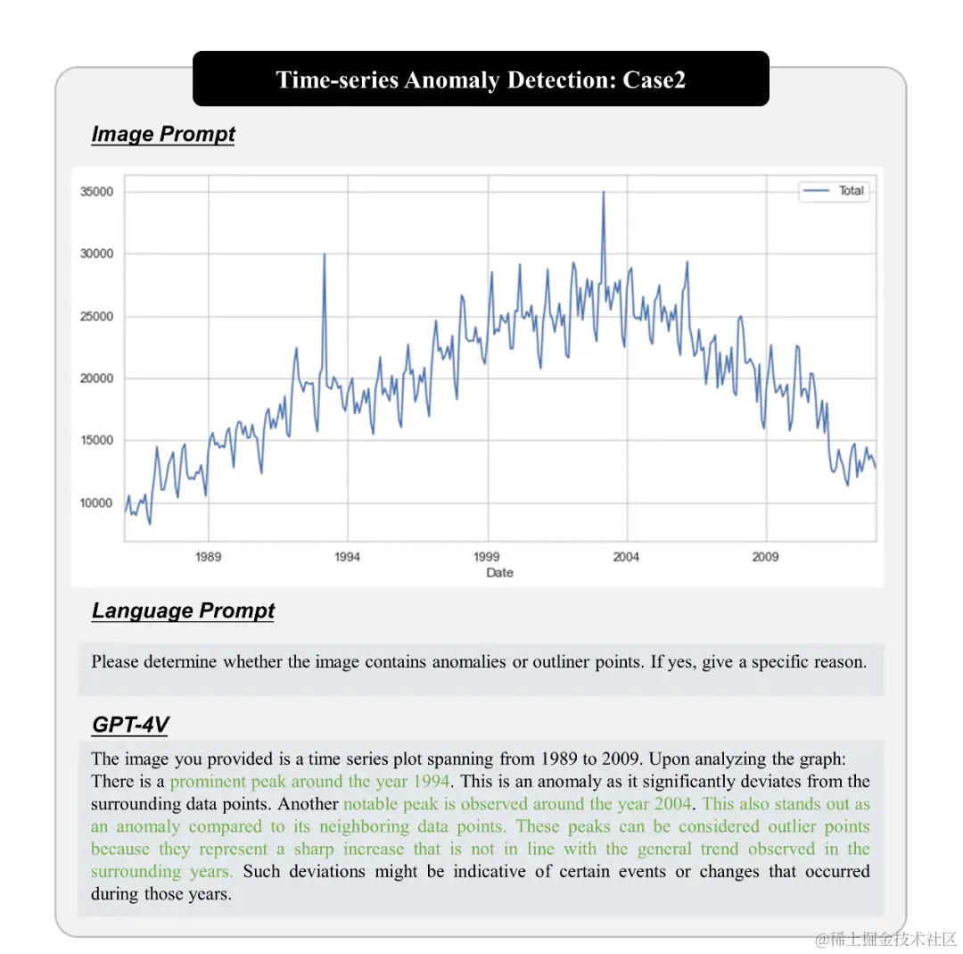时序检测是一种涉及到时间序列数据的异常检测任务,例如传感器数据、金融时间序列等。我们研究了 GPT-4V 在时序检测中的应用,测试了其在分析和检测时间序列异常方面的能力。