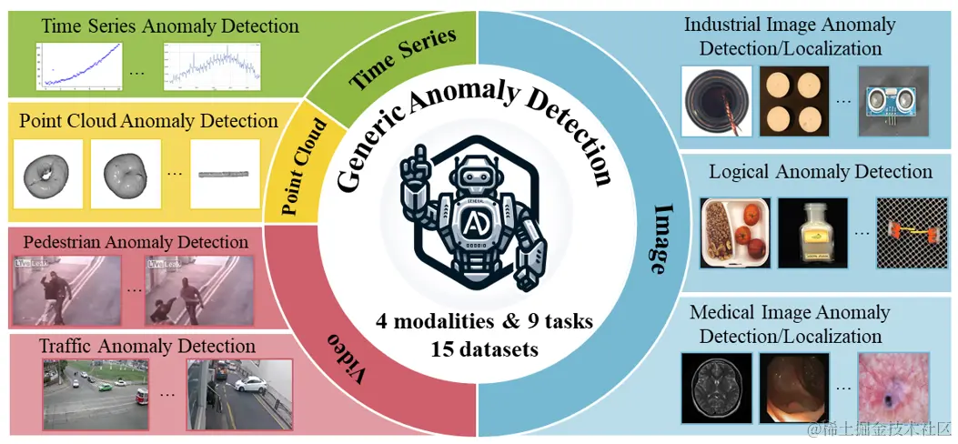 不同领域的数据集包含各种数据类型和类别,如图像、视频、点云、时间序列等。每种数据类型可能需要不同的异常检测方法,每个物体类别可能对应不同的正常标准,因此深入理解数据的多样性至关重要。