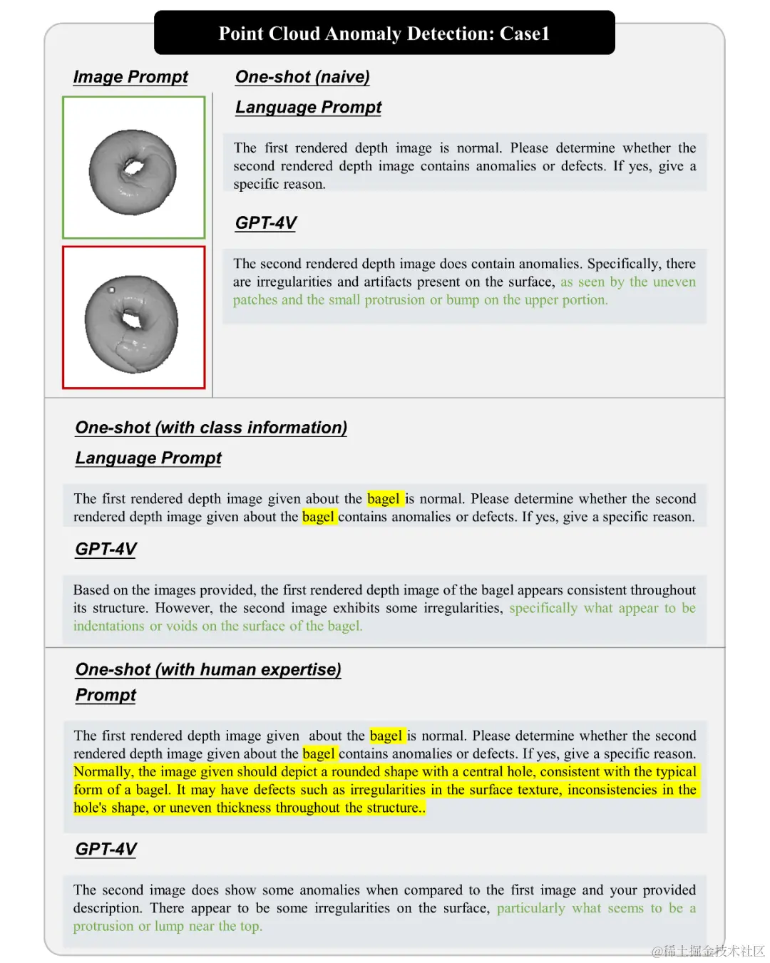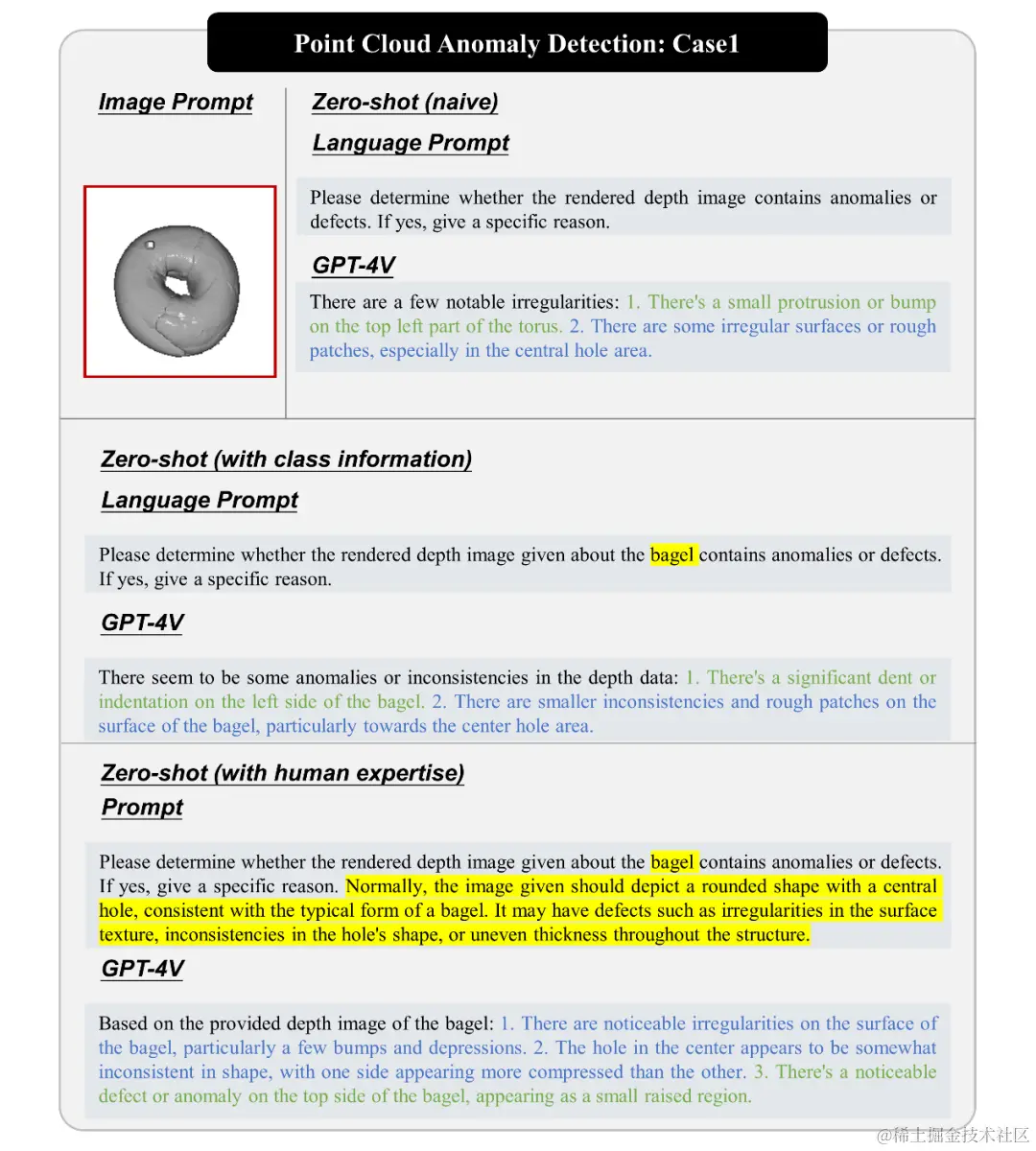 我们展示了 GPT-4V 在点云异常检测中的性能,包括识别袋圈中的小突起、检测绳子上的异常以及查找工件中的异常。GPT-4V 能够有效地识别这些异常,但在某些情况下也存在局限性,特别是在渲染质量较低的情况下。总的来说,GPT-4V 在点云异常检测中表现出了潜力。