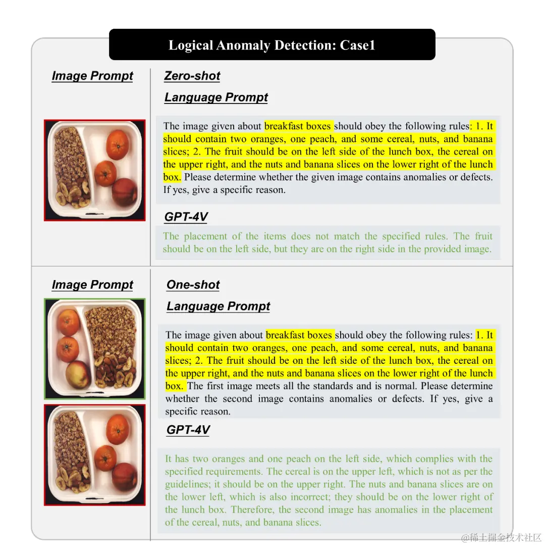 逻辑异常检测任务由 MVTec LOCO 数据集提出。该任务通常出现在装配过程中,需要识别各个组件是否正确组合。现有的逻辑异常检测方法通常依赖于视觉全局 - 局部对应关系,但本质上并没有真正理解图像内容。我们研究了 GPT-4V 在逻辑异常检测中的应用,探讨了其对图像内容的理解能力。