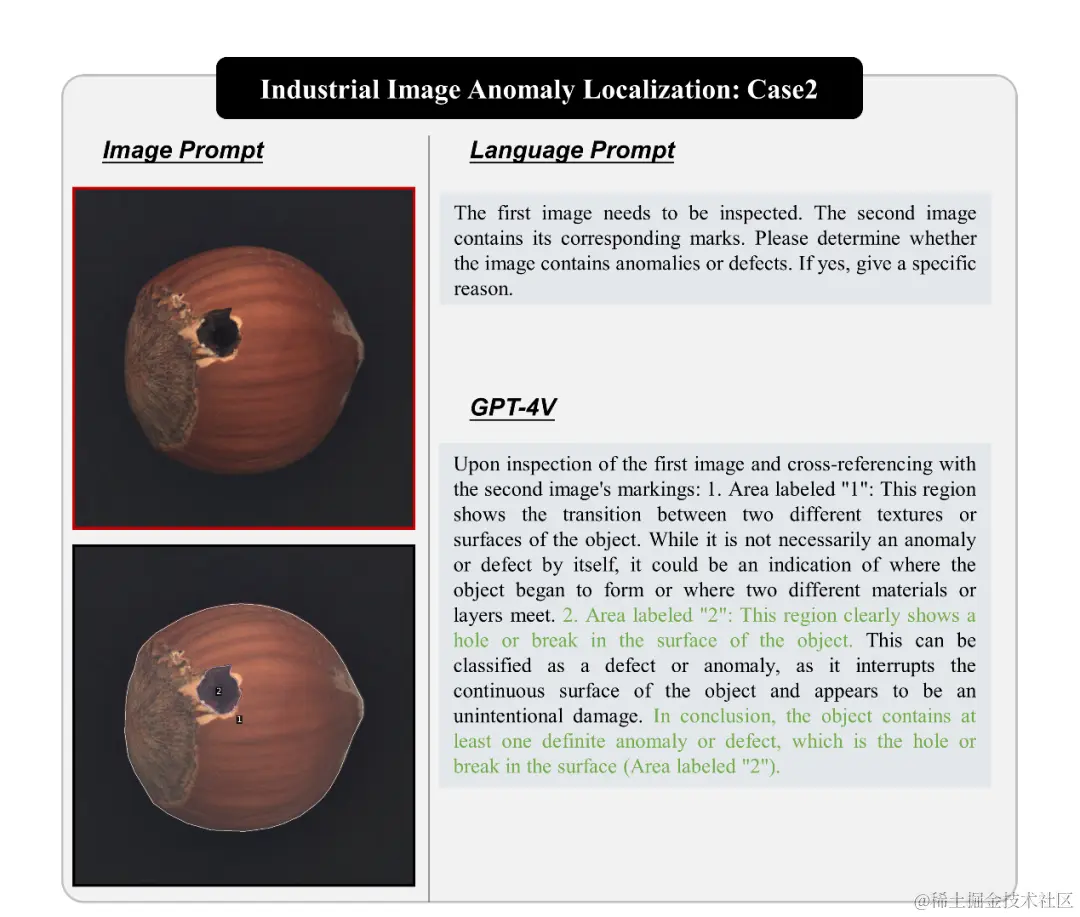 我们展示了 GPT-4V 在工业图像异常定位中的性能,包括定位弯曲的电线、坚果上的空洞以及识别电路板异常。GPT-4V 在一些情况下能够准确识别异常位置,例如能够有效定位坚果中的空洞,并且由于结合了视觉提示技术,GPT-4V 将异常定位问题转化为了对掩膜的分类问题,有效降低了问题复杂度,且提升了定位精度。因此,结合视觉提示技术和 GPT-4V 可有效解决工业图像异常定位问题。