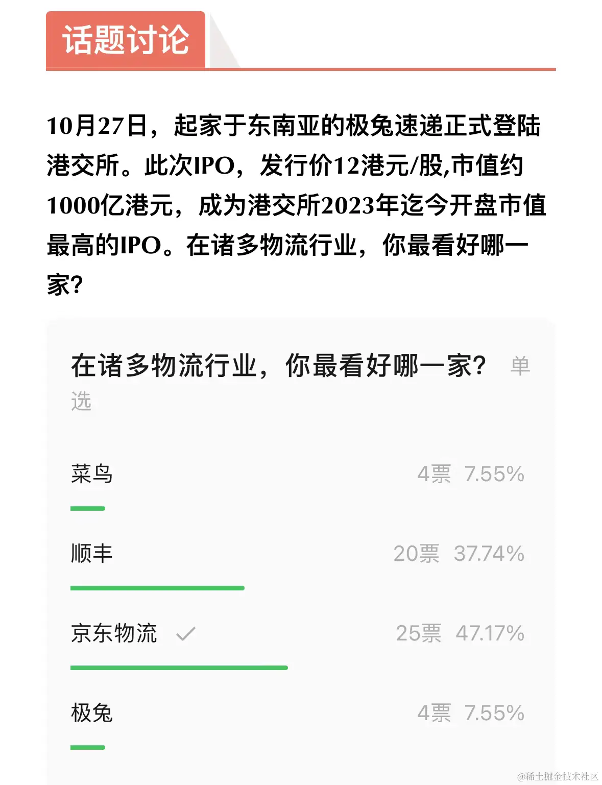 根据投票结果分析,极兔速递的 IPO 在受众中引起了相当的关注。顺丰和京东物流依然是物流行业备受看好的龙头企业,分别占据相当大的比例。菜鸟虽然有一定支持,但在此次投票中表现相对较弱。