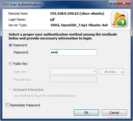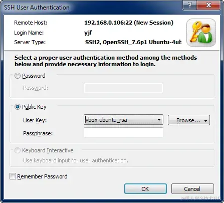 //1 进入用户根目录下的.ssh目录,使用命令生成公钥和秘钥(注意Enter passphrase输入的是私钥的密码 可以留空) $ ssh-keygen -t rsa Generating public/private rsa key pair. Enter file in which to save the key (/c/Users/ccczyl2006/.ssh/id_rsa): vbox-ubun tu_rsa Enter passphrase (empty for no passphrase): Enter same passphrase again: Your identification has been saved in vbox-ubuntu_rsa. Your public key has been saved in vbox-ubuntu_rsa.pub. The key fingerprint is: SHA256:giIl8zh168hymZJNocd3c4bOBJfX1kzNVo7ugfT/TdE ccczyl2006@ccczyl2006-PC The key's randomart image is: +---[RSA 2048]----+ | .o ..| | . . + +o | |o + o o . o +.. .| | X o = o . . + .| |= * + * S . +.E| | O B = = . o.| |+ B . o . o| | + .o| | o| +----[SHA256]-----+ //2 生成的文件带.pub为公钥 另一个文件为私钥 $ ll total 15 -rw-r--r-- 1 ccczyl2006 197121 73 四月 11 15:44 config -rw-r--r-- 1 ccczyl2006 197121 118 四月 25 2018 'config - Copy' drwxr-xr-x 1 ccczyl2006 197121 0 四月 11 20:51 copy/ -rw-r--r-- 1 ccczyl2006 197121 6755 四月 11 19:56 known_hosts -rw-r--r-- 1 ccczyl2006 197121 1679 四月 11 20:56 vbox-ubuntu_rsa -rw-r--r-- 1 ccczyl2006 197121 406 四月 11 20:56 vbox-ubuntu_rsa.pub//2 使用ssh-copy-id 命令拷贝公钥到服务器 $ ssh-copy-id -i vbox-ubuntu_rsa.pub yjf@192.168.0.106 /usr/bin/ssh-copy-id: INFO: Source of key(s) to be installed: "vbox-ubuntu_rsa.pub" /usr/bin/ssh-copy-id: INFO: attempting to log in with the new key(s), to filter out any that are already installed /usr/bin/ssh-copy-id: INFO: 1 key(s) remain to be installed -- if you are prompted now it is to install the new keys yjf@192.168.0.106's password: Number of key(s) added: 1 Now try logging into the machine, with: "ssh 'yjf@192.168.0.106'" and check to make sure that only the key(s) you wanted were added. //3 登录服务器确保.ssh目录下已存在authorized_keys文件 //4 存放私有的文件夹.ssh下使用以下命令即可使用无密码访问 $ ssh -i ./vbox-ubuntu_rsa yjf@192.168.0.106- xshell私有访问如下图