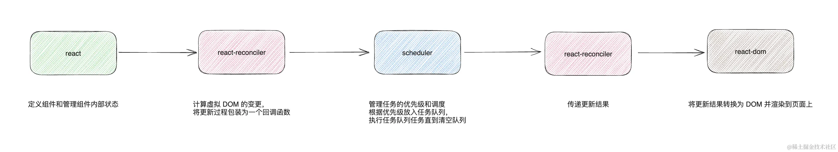 - 回调函数执行完成后获取到更新结果,交给渲染器(react-dom 或 react-native)渲染到页面上
