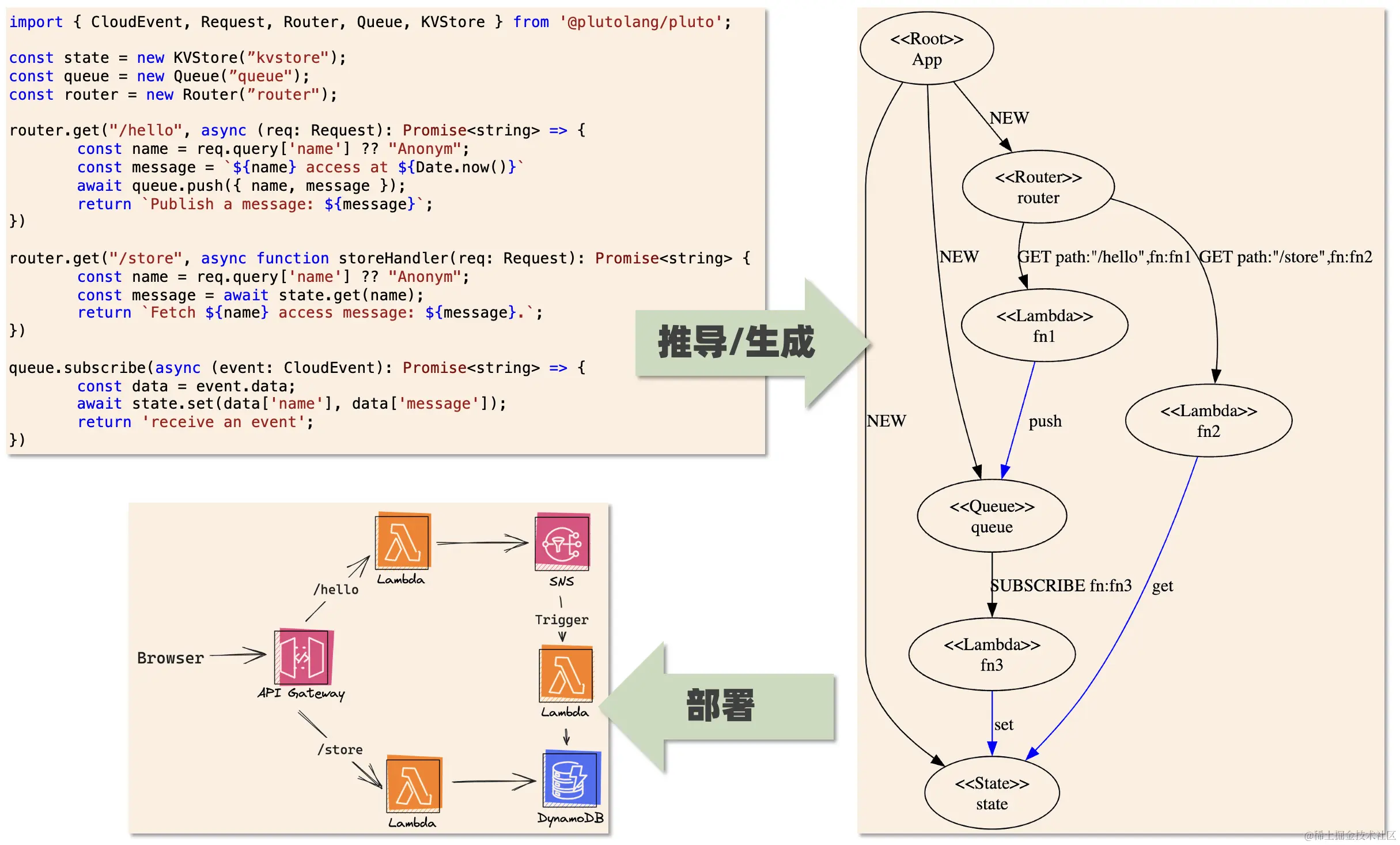 Plutolang 目前基于 TypeScript 进行实现,能够完成上图所展示的能力,也是 Demo 视频所对应的内容。用户编写一段 TS 代码,可以包含多个路由,以及 KV 数据库、消息队列等 BaaS 组件,不需要去控制台操作,也不需要编写基础设施代码,执行 pluto deploy 后,就能自动创建依赖的 BaaS 组件,以及将各个路由分别发布成 FaaS 组件。