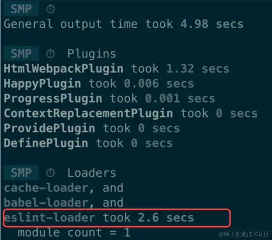 后续我发现在对不同文件模块进行更改时,编译时间有较大的差异,通过插件speed-measure-webpack-plugin对插件、loader耗时分析发现,部分loader运行时间不一致,编译慢是由eslint-loader导致的。