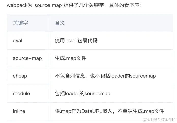从上图我们可以看到webpack为sourcemap提供的一些关键字,而sourcemap模式都是左边介绍的关键字进行拼接构成。