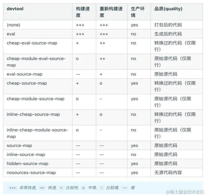 通过查阅sourcemap的配置,发现了问题是因为devtool配置为source-map的原因。之前的同学使用source-map可能是因为要做一些其他的处理,需要用到源码,现在并无此需要。Webpack支持sourceMap20+种不同的方式,通过关键字组合,可以生成用于各种场景的sourcemap。每种方式的速度和效果各不相同。效果最好的速度最慢。