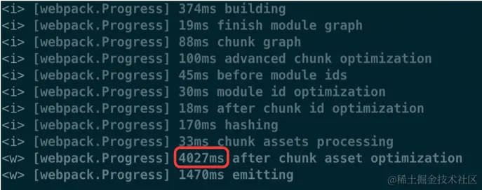 也就是说,ProgressPlugin可以监控各个hook执行的进度,输出各个hook的名称和描述,输出构建进度。 通过插件webpack.ProgressPlugin对webpack整个运行做了分析,发现耗时较长的阶段主要是生成sourceMap文件的阶段: