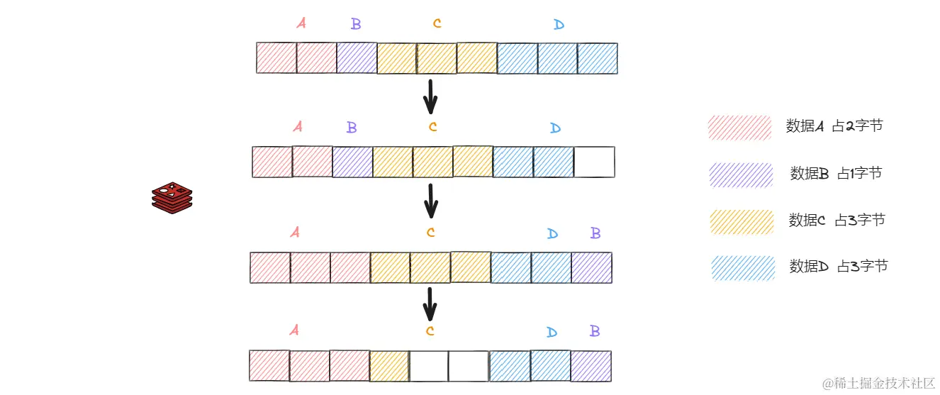 - A修改了数据,增加了一个字节。为保证A的内存空间连续性,B的数据拷贝到了第二阶段D释放出来的那个字节位置