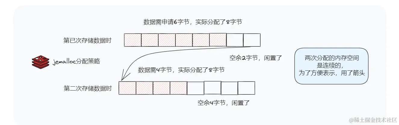 第一次存储数据是需要6字节,而Redis内存分配策略给你分配了8字节,空出2个字节的空间。