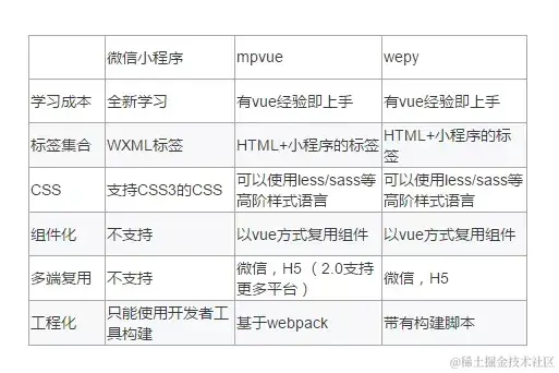但微信小程序一开始的复用能力非常弱,没有类继承,不能使用npm, 不支持Less、Sass, 因此基于它的转译框架就应运而生。第一代译转框架是wept、WePY、mpvue,它们无一例外是Vue风格的。因为WXML的模板指令与Vue非常相似,只是改一下就能兼容。当时也出现了一个MINA的框架,听说是微信团队开发的,可以单独架起Node.js后端,让小程序运于浏览器中,方便做单元测试。