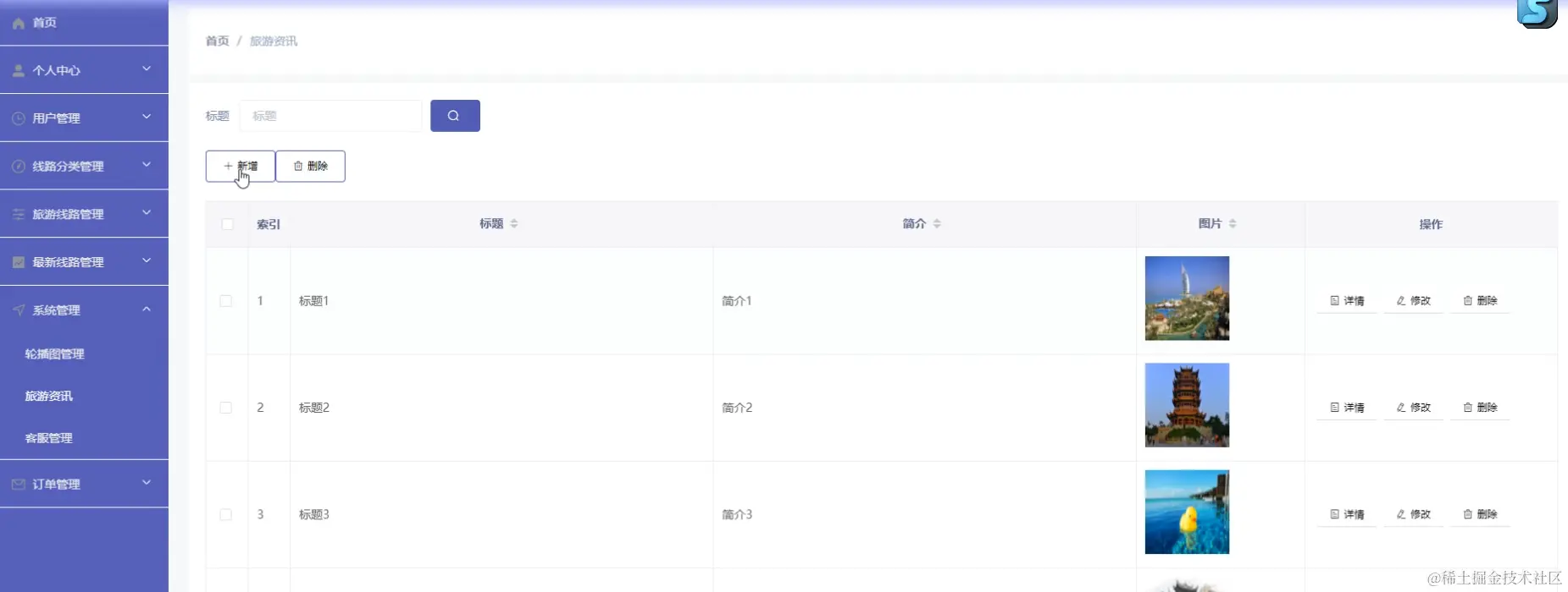 旅游资讯:管理员通过列表可以进行查看标题、简介、图片等信息,进行详情、修改或删除操作,并通过新增进行添加旅游资讯信息或删除操作,如图5-3所示。