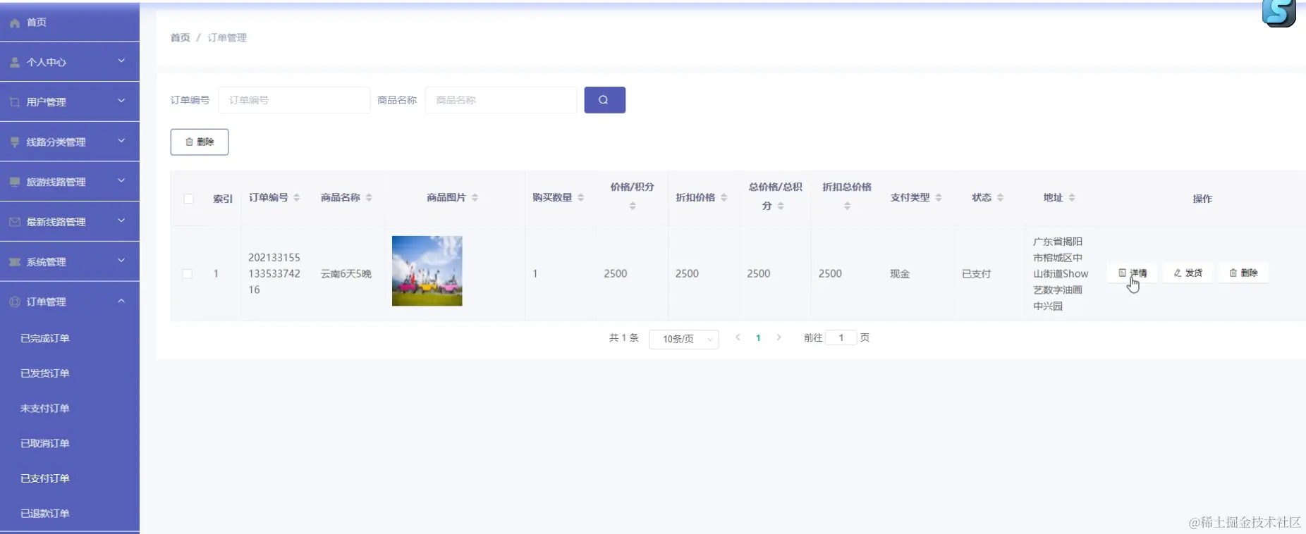 订单管理:管理员通过列表可以进行查看订单编号、商品名称、商品图片、购买数量、价格、折扣价格、总价格、支付类型、地址等信息,进行详情、发货或删除操作,并通过输入进行订单编号、商品名称操作,如图5-4所示。
