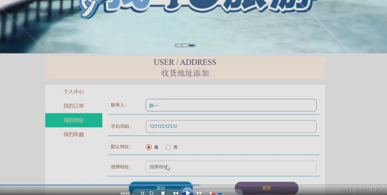个人中心:通过列表可以进行查看个人中心、我的订单、我的地址、我的收藏等功能,进行相对应操作,个人中心:通过页面可以进行修改用户名、密码、姓名、头像、性别、联系电话、余额等信息,进行更新信息操作,如图5-8所示。我的地址:通过列表可以进行查看联系人、手机号码、默认地址等信息、进行添加地址或重置操作,如图5-9所示。
