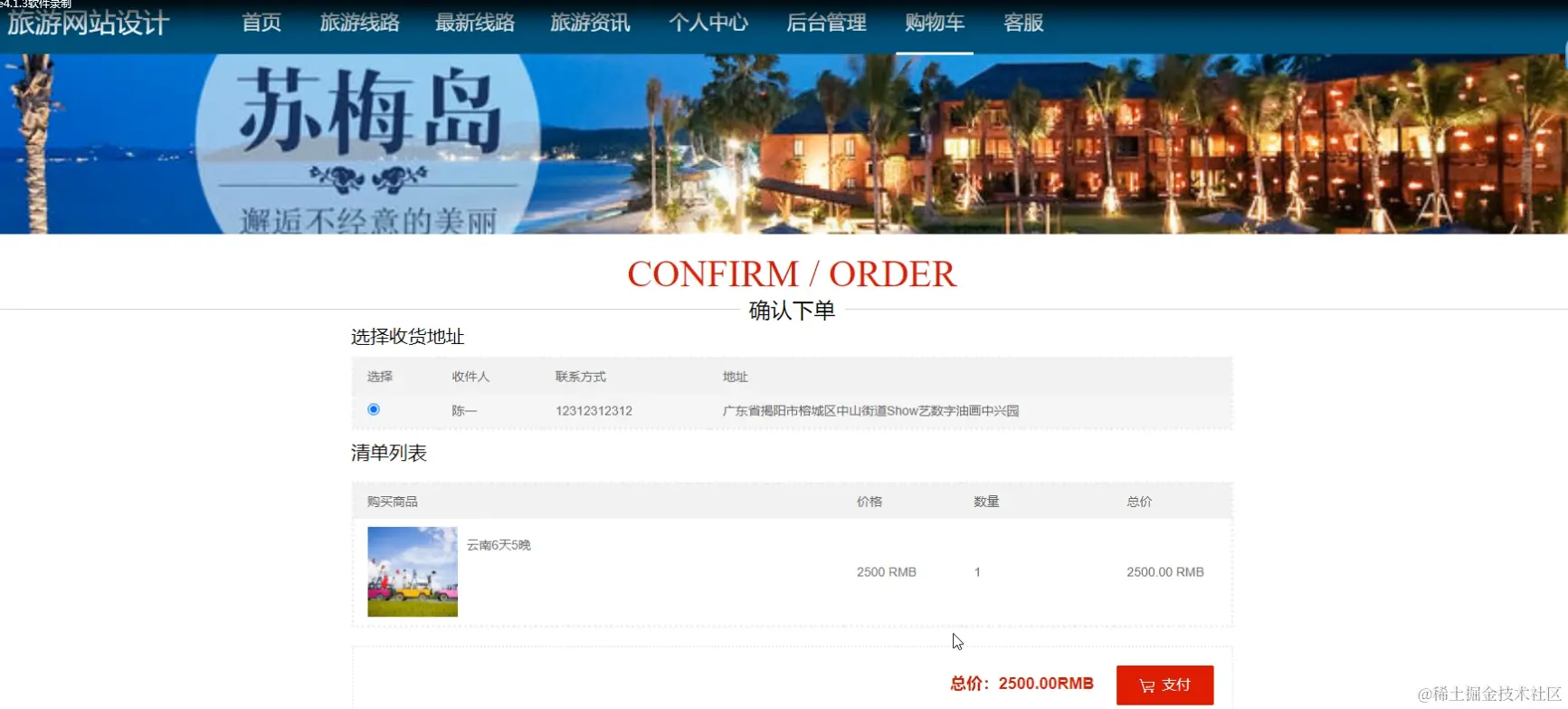 旅游线路:通过列表可以进行查看路线名称、价格、路线分类、景点名称、出发地、目的地、交通方式、出行时间、费用包含、点击次数等信息、进行添加购物车或立即购买、收藏操作,如图5-11所示。用户通过点击立即购买进入页面可以进行选择收货地址进行查看订单信息,进行在线支付操作,如图5-12所示。