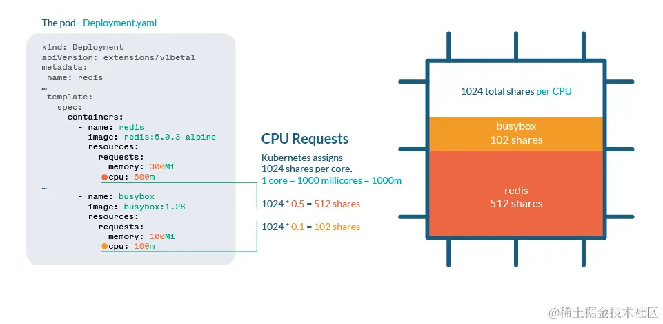 CPU在Kubernetes中通过共享来处理。每个CPU核心被划分为1024个共享,然后使用Linux内核的cgroups(控制组)特性在运行的所有进程之间进行分配。