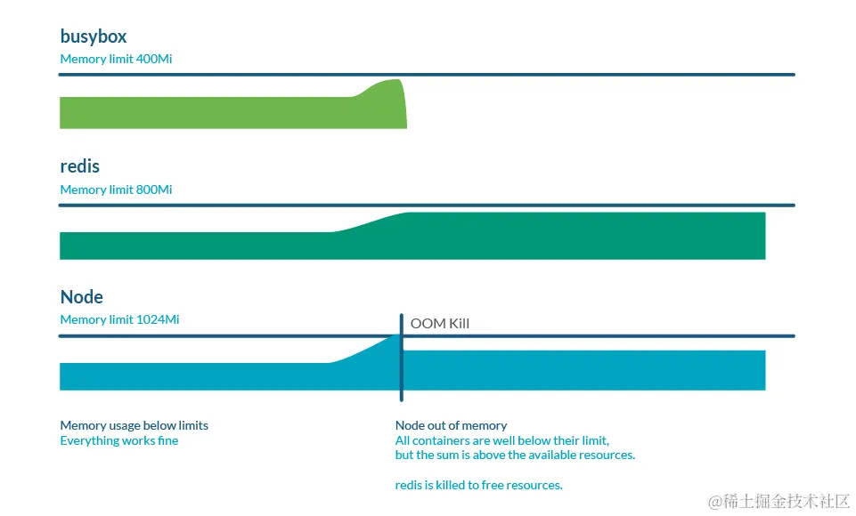 限制可以比请求的实际更高,因此所有限制的总和可以超过节点容量,这被称为超卖,这是虚拟化技术中比较常见的一种实现,但是实际上,如果所有容器使用的内存都比请求的内存多,它可能会耗尽节点中的内存。这通常会导致某些 Pod 死亡以释放一些内存