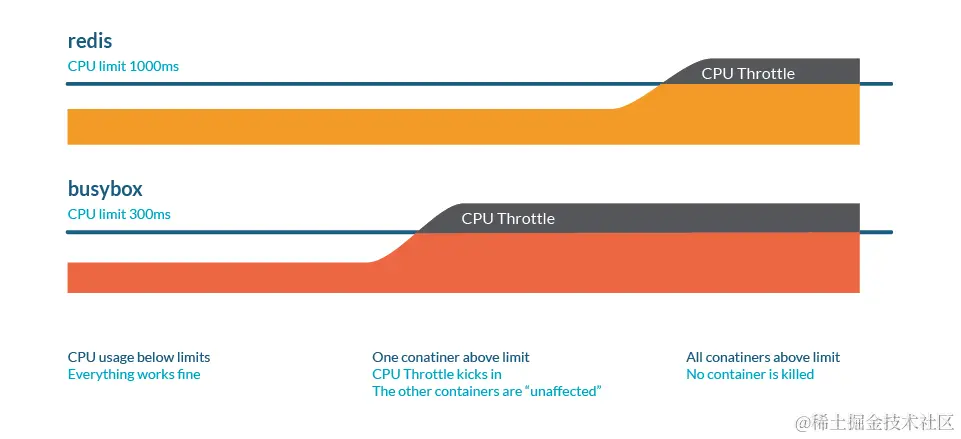 CPU限流在这里被表示为交通堵塞: 所有进程都会运行,但是运行的过程会变的缓慢。