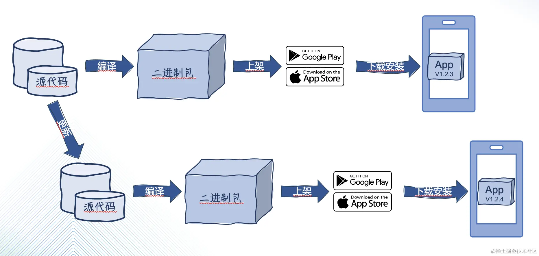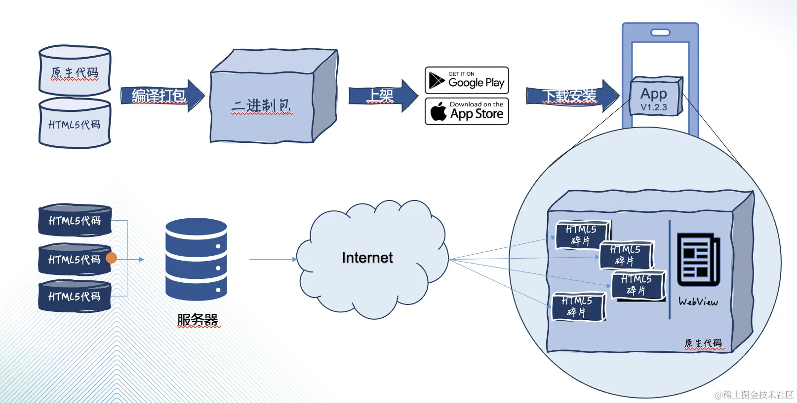 热更新的原理大概是这样的,通常应用内的服务器端会监测这些内容的更新,继而发送内容更新的通知并通过网络向客户端同步一些页面内容的碎片,并且把这些下载的内容,通常是 HTML 和 JavaScript ,注入到之前挖好的这些洞洞里。