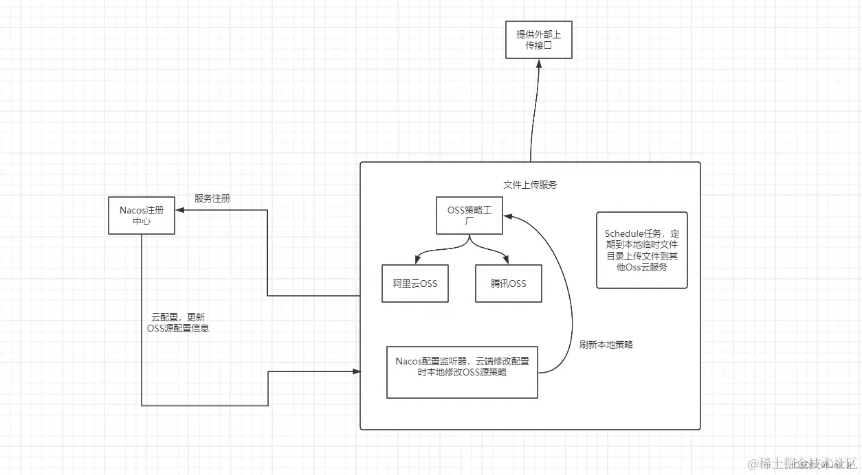 基础架构如下,主要基于Nacos云端配置功能,以及策略模式。并且该方案只实现bucket桶共有读情况下的方案设计。原理在于主要我们bucket桶名称相同,文件路径相同不同Oss服务只需要改变相应访问URL前缀即可达到迁移的效果。我们开放一个接口给前端定时调用获取当前系统的Oss源即可