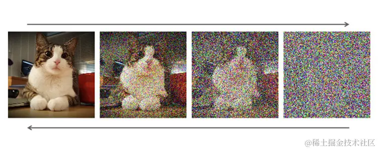 从左到右,图片演示了噪声的迭代添加,从右到左,它展示了噪声的迭代去除。