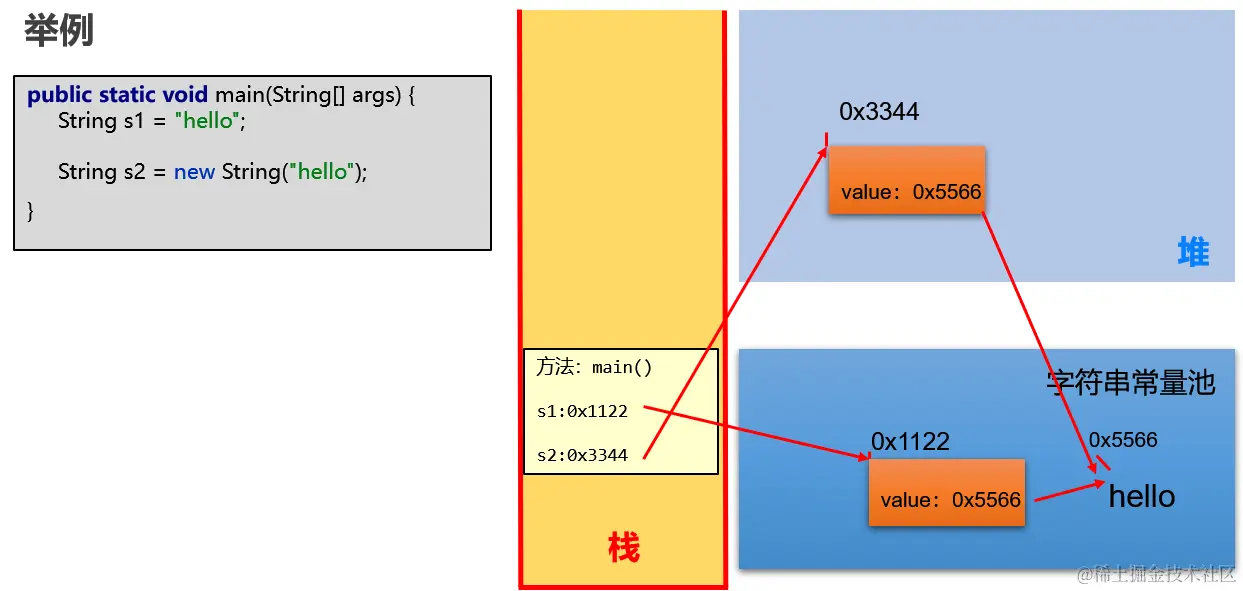 2.不是new出来的对象: 在创建时判断在常量池中是否存在需要的对象,如果不存在就开辟空间,创建字符串对象,同时为value数组也开辟空间,存在数据。在栈中的引用就指向了该常量池中的对象。