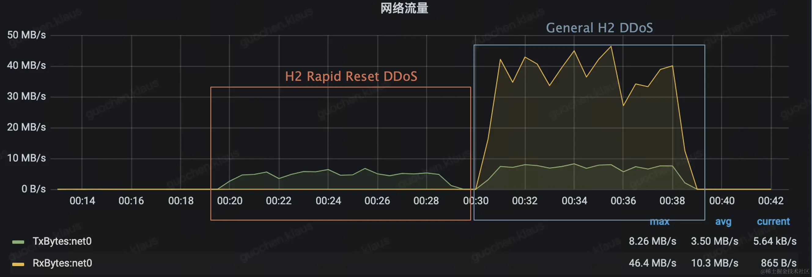 (1)H2 Rapid Reset DDoS和General H2 DDoS在上行带宽维度(客户端->服务端)差别不大;