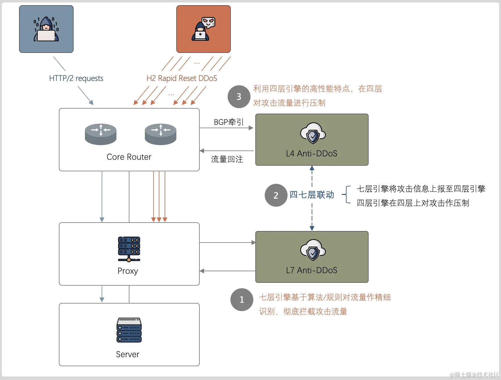 火山引擎网络安全团队测试确认:当H2 Proxy遭受H2 Rapid Reset DDoS时,攻击请求的QPS会被转化针对源站的SYN Flood + RST Flood,具体过程: