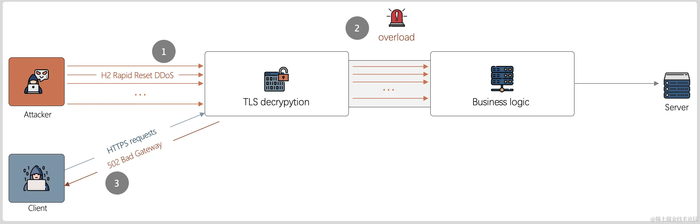 前面只是在协议层面的分析,而实际现网的攻击效果中还需结合业务架构综合评估。当前业界常见的HTTP服务架构通常是在Web服务段前部署HTTP/2反向代理集群,且为了实现高性能、高可靠,代理集群会对请求作异步处理:例如处理HTTPS流量时,要先经过TLS解密模块进行解密,再将解密后的明文数据上报至上层服务,这使得H2 Rapid Reset DDoS有更大发挥空间:(如图7)