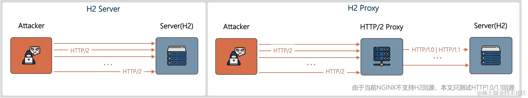 为了全面、客观、量化地分析H2 Rapid Reset DDoS的实际效果,火山引擎Anit-DDoS团队基于NGINX搭建了HTTP/2 Server和HTTP2 Proxy(反向代理)两种常见的业务场景进行测试(见图5)。