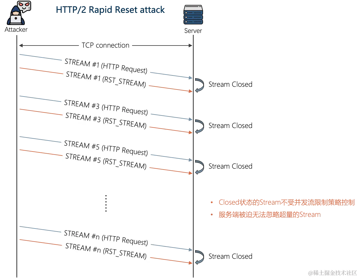 H2 Rapid Reset DDoS(CVE-2023-44487)的核心原理就是:恶意利用HTTP/2的重置机制绕过服务端对单个TCP连接的并发流数量限制(max_concurrent_streams),迫使服务端处理超量的请求,增强攻击效果。
