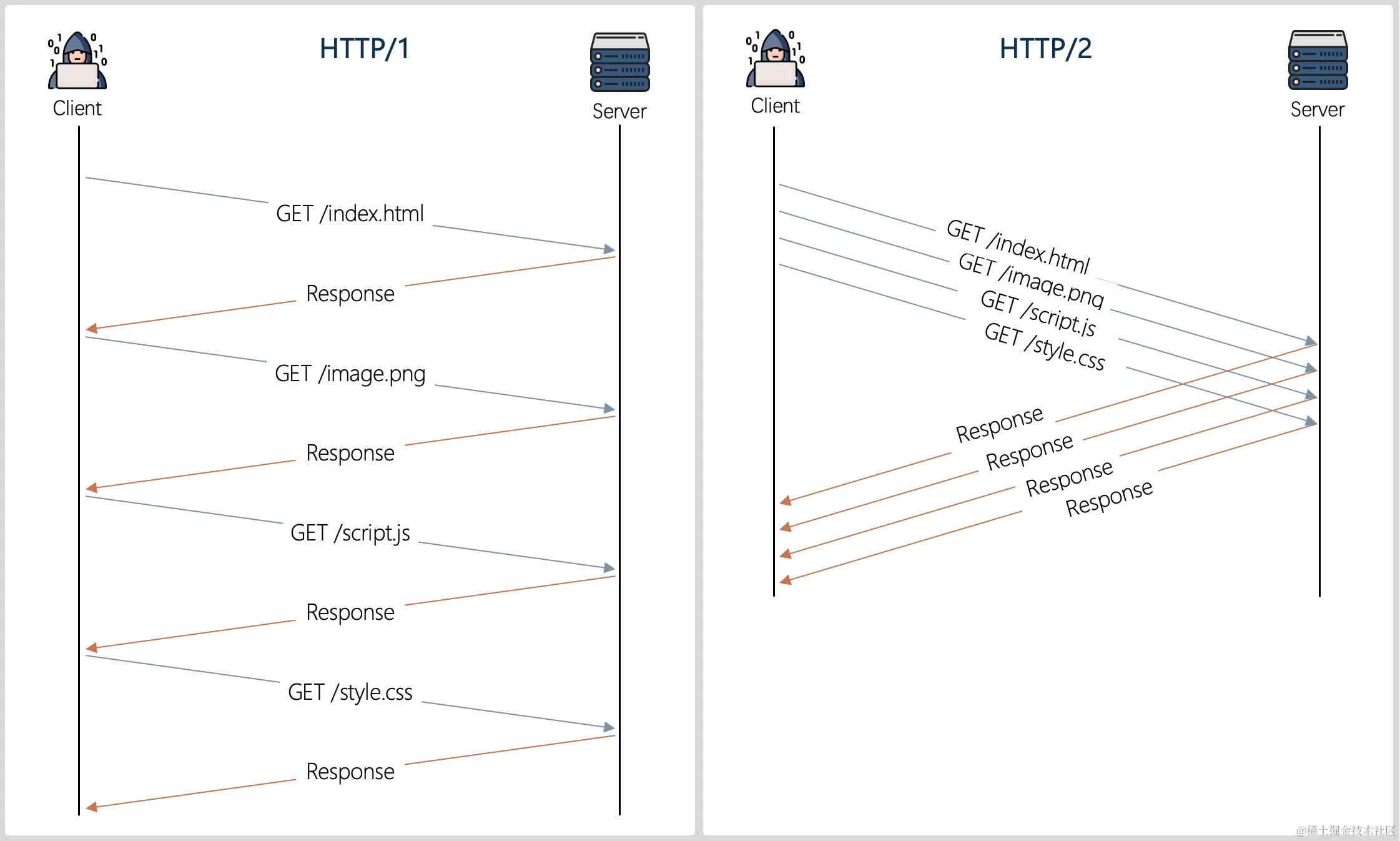 图1 HTTP/1和HTTP/2访问流程对比