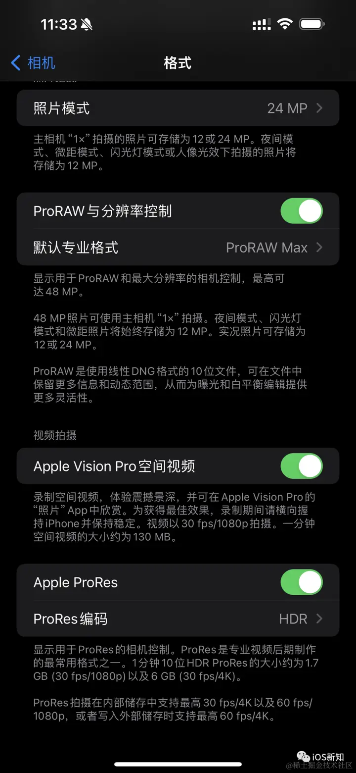 这是苹果发布 iOS 17 时承诺的功能,目前在 iPhone 15 Pro 上,这个版本终于来了,在设置 -> 相机 -> 拉到最下面,多了一个 Apple Vision Pro 空间视频的开关,打开之后就可以在相机应用里录制空间视频了。