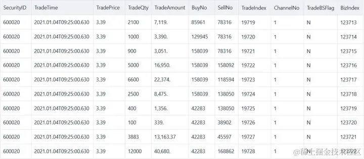 很多存储在 PostgreSQL 中的数据,可以通过上述的两种方式将数据同步到 DolphinDB 中。本文的实践案例基于 2021.01.04 号一天的逐笔成交数据,数据量约 2721 万。其部分数据示例如下:
