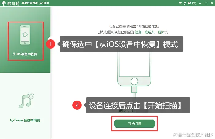 步骤3:设备连接成功后,在软件首页点击【开始扫描】选项进行免费扫描。